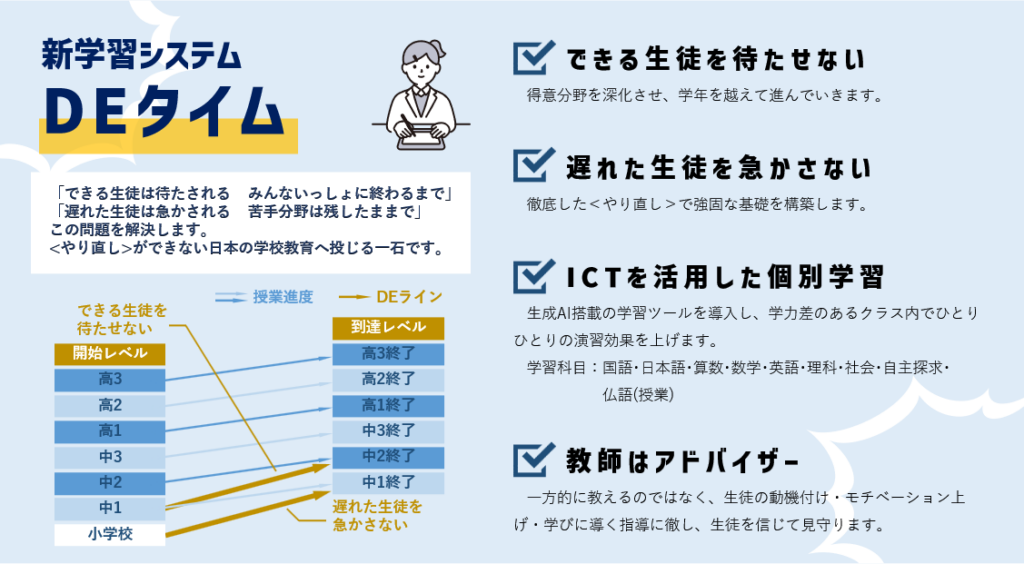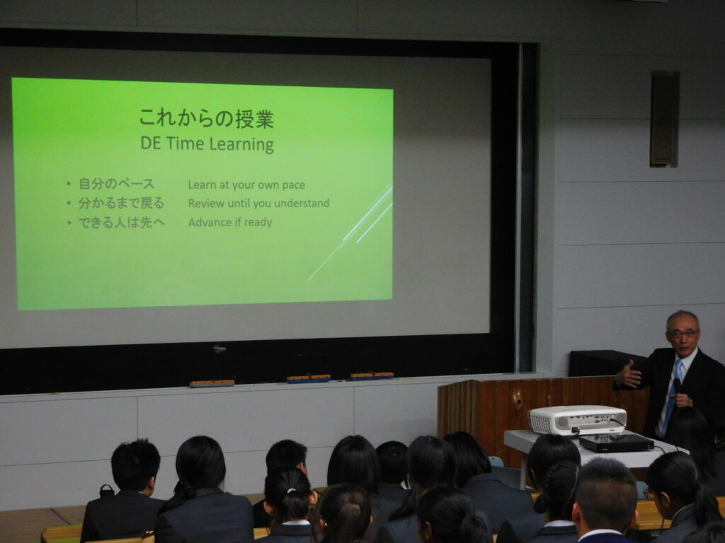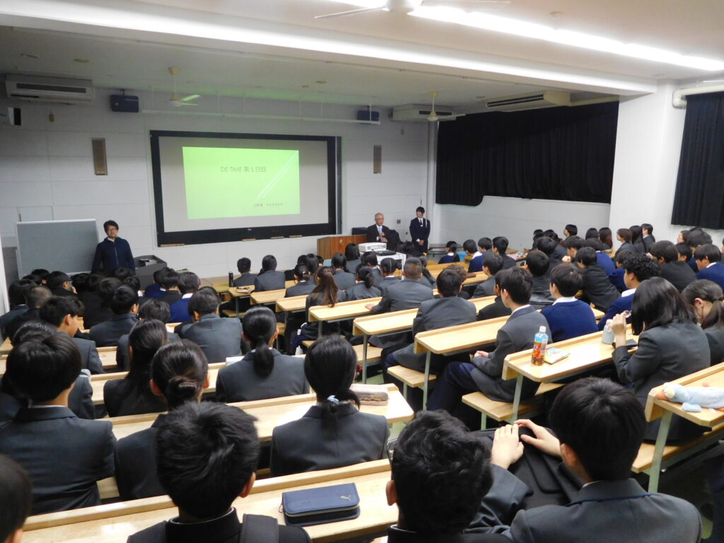 【中1中2】DEタイム説明会 2026 4/09 トピック 学校改革 学校説明会 2026年4月9日 今年度から導入されたDEタイムの初回説明会が行われ、校長からDEタイム導入の意義が丁寧に説明されました。 次回タブレットが配付され、本格的に学習が始まります。 来週以降になるかと思いますが、本ウェブサイトで実際の様子をお伝えしますのでお楽しみに! DEタイムについて詳しい話を聞きたい方は学校説明会へ! 今年度初回の説明会は4/25(土)です。 トピック 学校改革 学校説明会 2026年度 開始! 関連記事 2026年度 開始! 2026年4月8日 入学式 2026年4月7日 【中1高1】オリエンテーション2日目 2026年4月7日 【中1高1】オリエンテーション初日 2026年4月4日 2026年4月25日(土)学校説明会 | 暁星国際中学校・高等学校 2026年4月1日 【高1】総合探究 人身取引について 2026年3月27日 年度末のご挨拶 2026年3月14日 【2月】人気記事ランキング 2026年3月13日