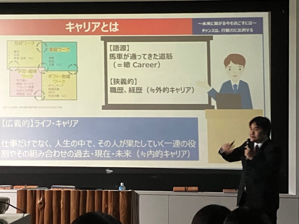 9月23日に本校卒業生の金利龍志郎氏(三菱ケミカル・クリンスイ株式会社インダストリアルソリューション部部長)をお迎えして、高校2年生を対象に「総合探究」の特別授業を行いました。大学から大学院までの学生生活やご就職、社会人としてのお仕事やご経験など、多岐にわたるお話を伺いました。国内外のビジネスの第一線でご活躍する同氏から、歯科医院で使われているデンタル・チェアなど、幅広く利用されている濾過フィルターの製品にまつわるお話やキャリア形成についてのアドバイスも聞くことができました。生徒たちは普段あまり聞くことのないビジネス界の話に興味深そうに耳を傾け、貴重な学習の一時となったようです。
