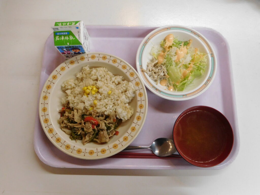 今回はスパイシーポークライスでした。スパイシーに味付けされた豚肉・ピーマン・パプリカ・玉ねぎと、コーンの入ったペッパーライス。