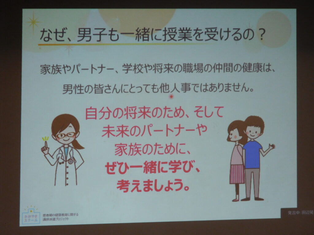 生徒① 女性の体についての講演を男子生徒も一緒に受けさせてもらいました。女性への思いやりや気遣いを大切にしていきたいです。たった1つの行動で自分や相手の未来を壊してしまう可能性があるので、行動に責任を持っていきます。