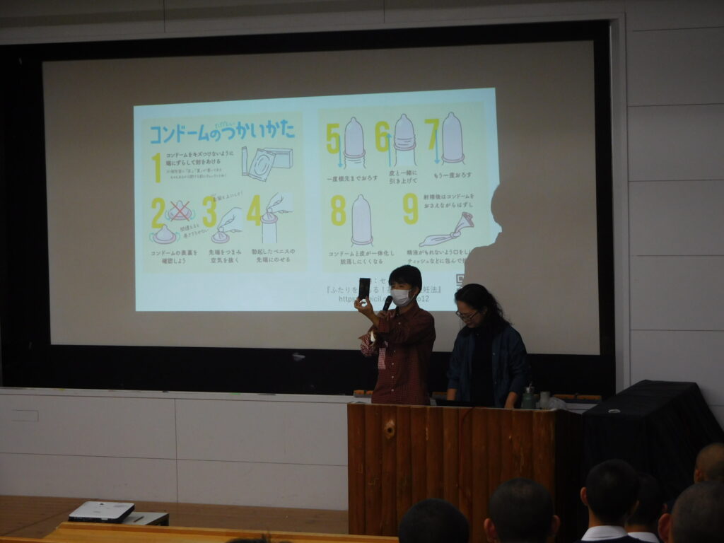 避妊についての説明では、医師の立場から保健体育の授業で扱う内容よりさらに具体的なお話がありました。避妊だけでなく感染症予防の観点からも、自分と相手を守る行動の大切さが伝えられました。生徒たちは真剣に耳を傾けていました。