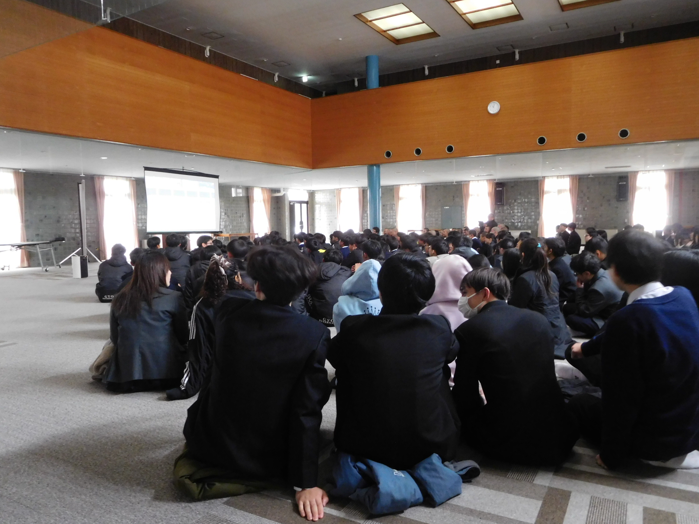 奇しくも本日は3学期の開始日。校内では生徒・教職員が集まり、ネット配信を通じて準決勝の様子を見守りました。