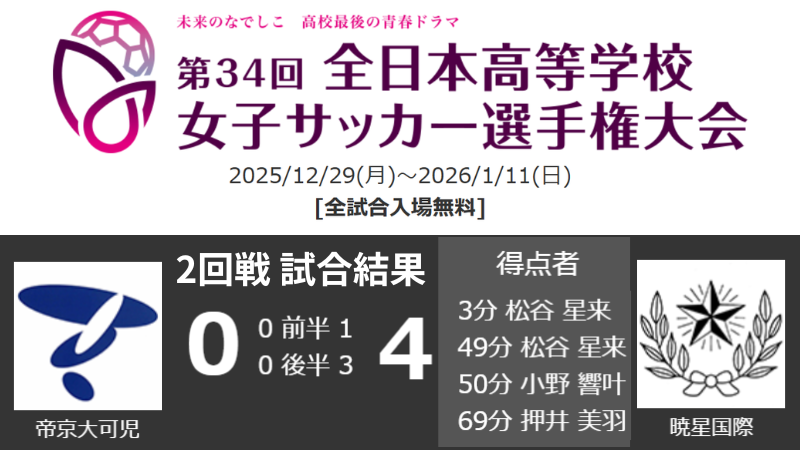 🏆第34回 #全日本高校女子サッカー選手権 🏆⚔️2回戦 試合結果✍️#常葉大橘 2-1 #神戸弘陵#工大福井 1-1(PK4-2) #専大北上#十文字 2-2(PK6-7) #日本航空#帝京大可児 0-4 #暁星国際#作陽 2-0 #明桜#尚志 0-0(PK3-5... -